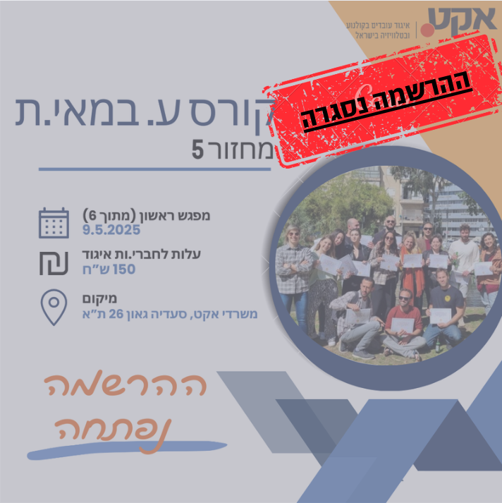 המפגשים יתקיימו במשרדי איגוד אקט – בית העמותות, רחוב סעדיה גאון 26 ת"א, בימי ו'.